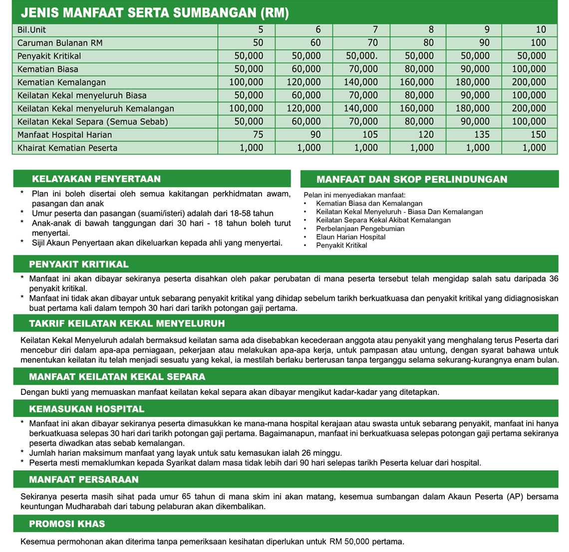 Dalam usaha menyebarkan amalan takaful dalam kalangan masyarakat di Malaysia, CUEPACS telah memperkenalkan Pelan Takaful Keluarga Mutiara Plus. Pelan takaful ini terbuka kepada anggota sektor awam dalam Kementerian / Jabatan / Agensi / Pihak Berkuasa Tempatan dan pasangan serta anak-anak mereka.